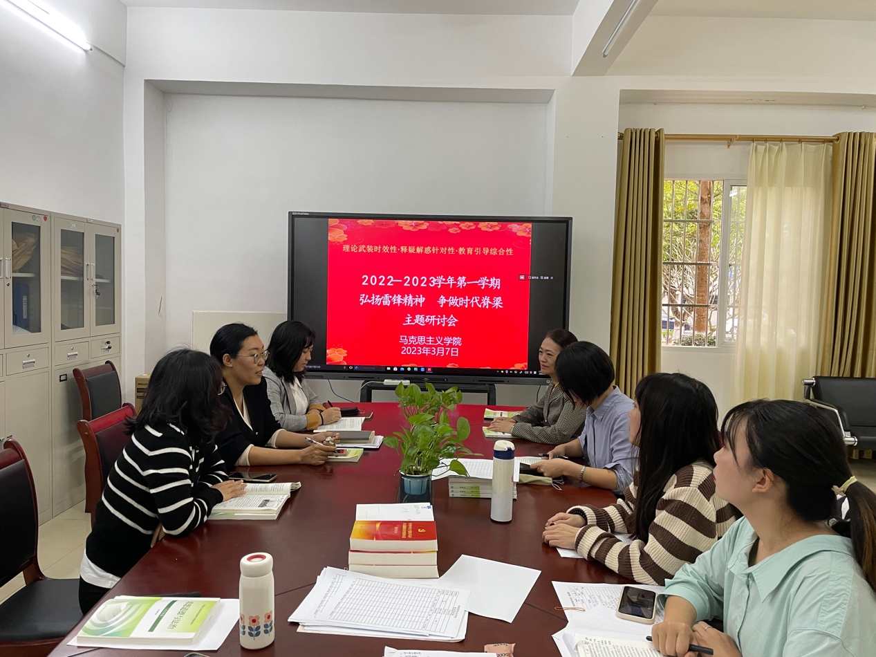会议伊始,与会教师根据《中共海南省教育厅委员会组织开展2023年春季学期“开学第一课”活动的通知》的要求,结合海南经贸职业技术学院“青春建功自贸港 志愿服务新时代”2023年学雷锋志愿服务月活动,就“弘扬雷锋精神 争做时代脊梁”融入第五章《遵守道德规范 锤炼道德品格》的教学开展了主题研讨。