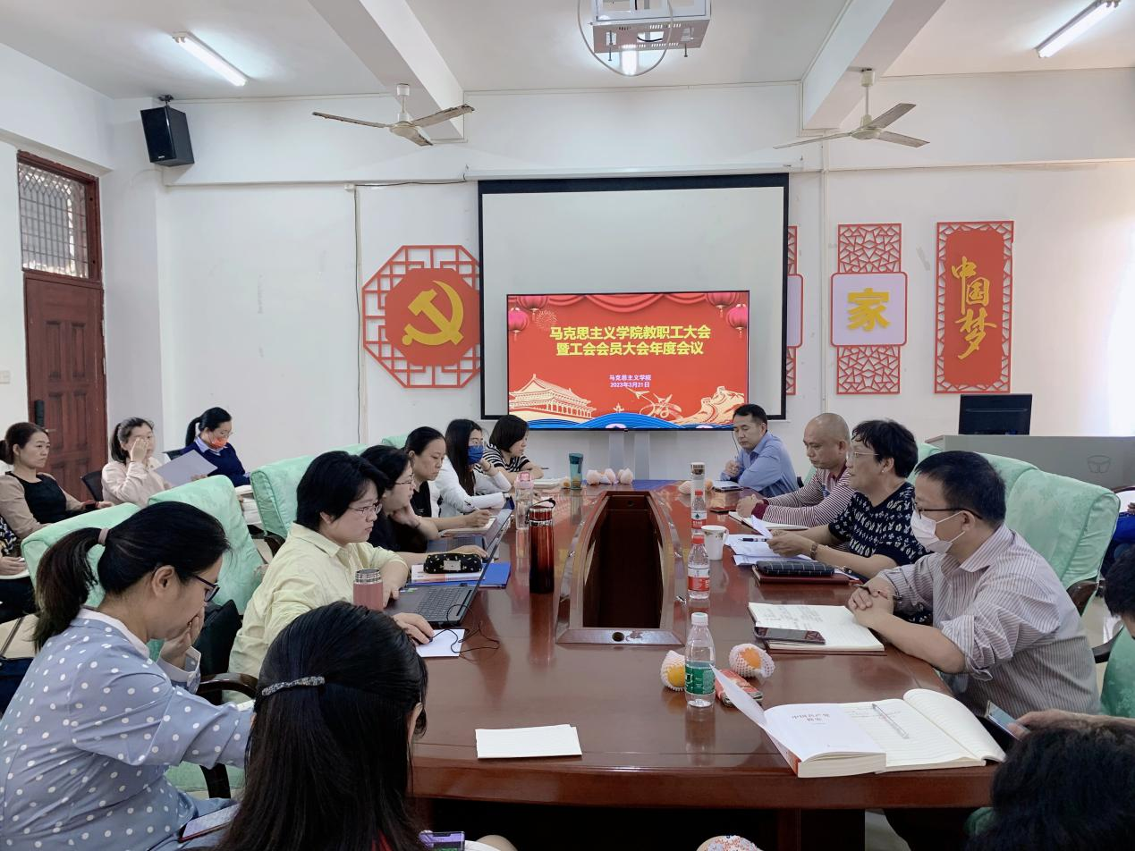 会议伊始,马桂琴院长向全体教职工简要报告了2022年度学院在党建工作、教学工作及行政事务工作等方面所取得的成绩。在党建工作方面,学院教师党支部党建工作紧紧围绕上级党委的工作重点和党史学习教育的目标,紧紧依靠广大教职工,按照“围绕教学抓党建,抓好党建促教学”的工作思路以及“教学与党建一体化”的党建工作模式,在学院“双带头人”教师党支部书记工作室的引领下,以党建与教学相融合,党建与大学生教育相融合,党建与科研相融合,党建与理论宣讲相融合,党建与社会服务工作相结合的“五融合”模式,以开展党的二十大精神学习为核心,突出重点,强化措施、抓好落实,确保各项工作取得实效。在教务工作方面,紧紧围绕“向课堂要质量,向教改要成效”这条主线,大力实施“一体两翼一保障”教学模式改革,在学院全体专兼职教师的共同努力下,学院的日常教学管理进一步规范、科学,教学管理制度化、规范化程度进一步加强,思想政治理论课教学管理与教学改革工作有序推进。在行政事务工作方面,从加大教师引进力度和师资队伍培训等方面加强师资队伍建设;从切实规范科研管理和结合思政课特点开展教研和科研活动,稳步提升科研水平。