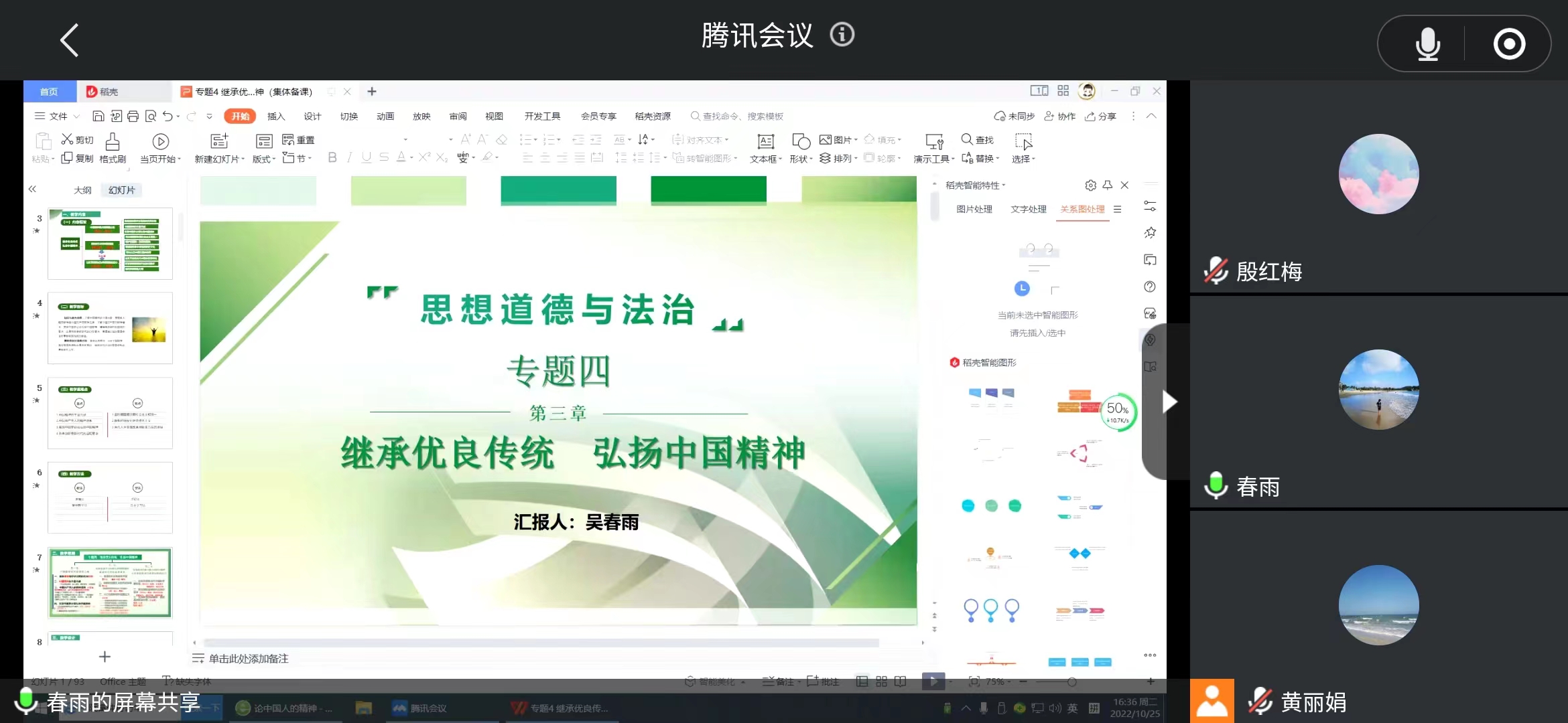吴春雨、王艳华、陈文轩、王冰四位老师就第四个专题《继承优良传统 弘扬中国精神》也是分别从内容框架的梳理上、教学方法的创新上、教学手段的运用上进行了主旨备课。八位主旨备课老师的讲解各有侧重,各种思考,随后各点评发言补充教师对主旨备课教师的内容进行了点评,并提出了自己的意见和建议。