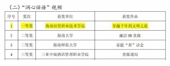 2025年1月3日,中共海南省委教育工作委员会公布2024年“清廉文化进校园”系列主题活动获奖作品,海南经贸职业技术学院9428cn太阳集团古天乐殷红梅、李鼎、吴春雨、王艺霏团队的作品《穿越千年的文明之旅》在系列主题活动中脱颖而出,荣获“润心话语”视频组一等奖。