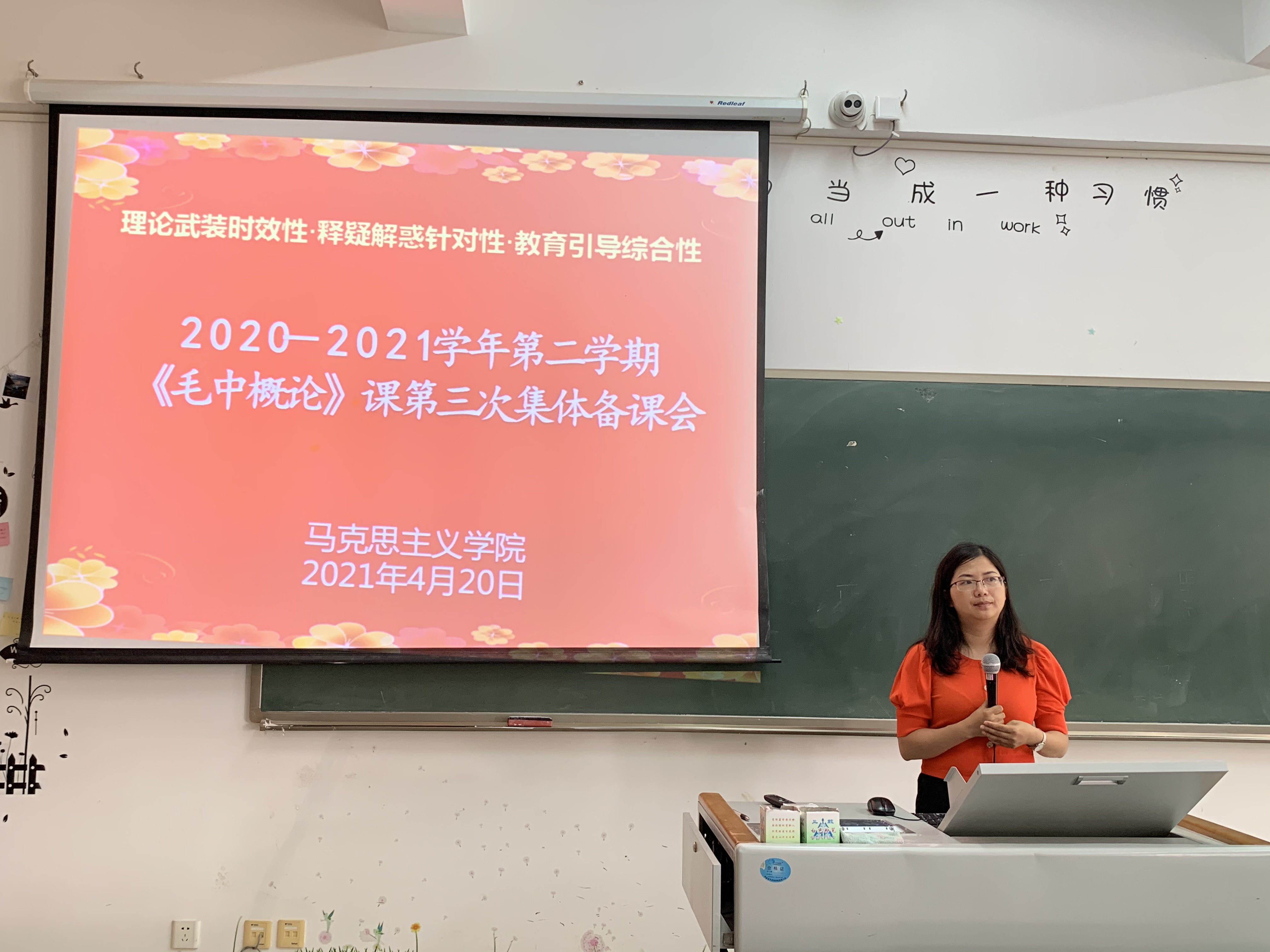 2021年4月20日下午,9428cn太阳集团古天乐在第二教学楼205教室举行本学期第三次集体备课会,由马桂琴、李明明、于金伟、吴海翠、刘芳、王冰六位老师作主旨专题汇报。目前在常态化集体备课制度的影响下,教师之间已形成一股“教研合一”的文化交流风,授课前期集体对“教学设计”进行研磨,课程中关注“教案”的实施应用情况,在“评课与反思”活动中商讨后续课程的发展,不断对内容体系优化重组,力求务实创新,使“教”和“研” 的智慧充分发挥。马院负责人表示,集体备课制度的长期运行,促使思政教师们形成团结合作、锐意进取的良性运行机制,真正实现教师集体的可持续发展。接下来的集体备课活动要坚持统一性、完整性和超前性原则,教师们要仔细研读大纲和教材、分析学情,发扬好共同审定教学设计和反馈教学实践信息的优良传统,让常态化集体备课会发挥出最大效能。