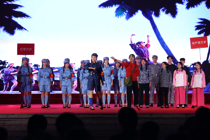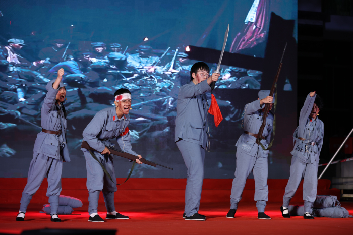 “救国篇:开天辟地”中,情景剧《初心》回顾了中国共产党风雨百年,沧桑巨变,不变的是共产党人对初心的坚守、对使命的担当;情景剧《信仰》演绎了红军长征途中最惨烈的战役——湘江血战,通过学生生动的表演让观众深刻地感受到:一个政党有了远大理想和崇高追求,就会坚强有力,无坚不摧,无往不胜,这就是共产党人的坚定信仰;情景剧《红色娘子军》则是把观众带回到了“战士责任重,妇女冤仇深”的特殊的历史年代,和红色娘子军一起感悟那代人为了理想,为了自由奋起反抗、艰苦奋斗的革命精神;大合唱《南泥湾》、《中国人民解放军进行曲》铿锵有力,充分表达出了铮铮铁骨的人民军队,脚踏着祖国的大地,背负着民族的希望,带着不可战胜的力量,取得了解放战争的胜利。“兴国篇:改天换地”中情景剧《最后的家书》通过一段段刻骨铭心的事迹,一句句发自肺腑的深切感悟,仿佛带领大家再次回到了那个烽火硝烟、坎坷动荡的革命战争年代,在演绎者的一声声呼唤中不禁让人潸然泪下;情景剧《回国》演绎了有志之士回国报效祖国的艰辛道路。“富国篇:翻天覆地”中朗诵节目《春天的故事》表达了改革开放以来新中国取得的伟大成就。“强国篇:惊天动地”中情景剧《脱贫攻坚——庄严的承诺》以我校驻水头村第一书记们为原型,展示了历任第一书记在水头村无私奉献的事迹;歌舞表演《万疆》呈现了中国共产党的百年答卷。在各个节目演绎过程中还设置了关于“七一”重要讲话和“十九届六中全会”精神的两轮知识问答环节,帮助同学们更好地领会“七一”重要讲话和“十九届六中全会”的精神。