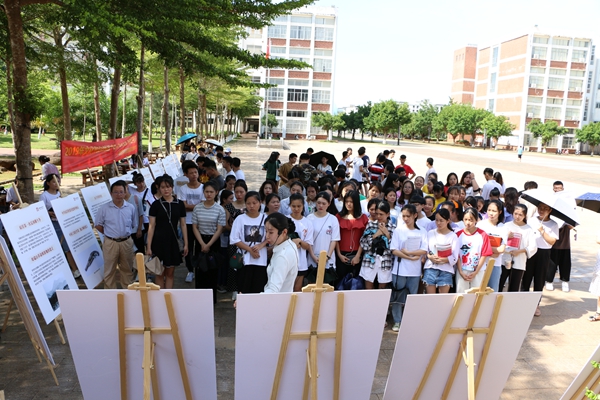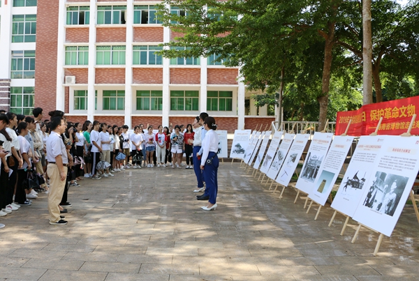 省博物馆工作人员在学校图书馆前支起了展板,为学生们重现了琼崖革命纵队“二十三年红旗不倒”的光辉历程。为加深同学们的记忆,工作人员将这段历史作了详细的讲解。自1927年椰子寨战斗打响琼崖革命武装斗争第一枪,直到1950年海南解放,琼崖纵队在中共琼崖特委的领导下,坚持孤岛奋战,百折不挠,经历了土地革命战争、抗日战争和解放战争三个艰苦卓绝的战争阶段,经历了从农民群众自发组织的琼崖讨逆军到党领导的琼崖工农革命军、琼崖工农红军,再到琼崖抗日独立队、独立总队,最后到中国人民解放军琼崖纵队等军队建制改编,用鲜血和生命书写了二十三年红旗不倒的壮丽史诗。